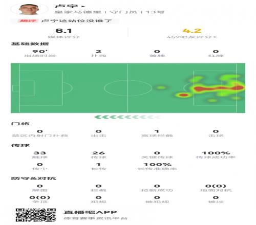 卢宁本场2扑救+0扑救禁区内射门传球成功率100%获评6.1分