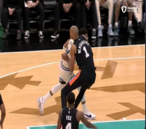 文班在防守字母哥时与对方对撞膝盖痛苦倒地,现已返回更衣室