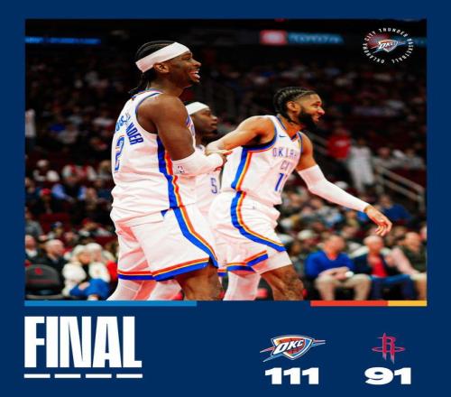 乌杜卡不满米切尔的回场失误裁判没有吹罚,结果他领到技犯,亚历山大罚球命中,雷霆队以100-83领先。火箭队继续进攻哑火,亚历山大连造犯规四罚三中,第四节还有3分钟时他们领先20分。大比分差距让火箭队提前缴械换下主力,雷霆队随后也尽遣替补,他们以111-91获胜。