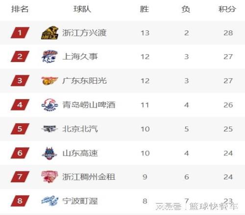 积分榜第6名则属于山东队,最近山东队状态火爆,截止到目前,他们已经豪取8连胜,球队的战绩也变成10胜4负。不过,由于少赛一轮的缘故,山东队的排名稍微吃亏,暂时排在积分榜第6名。而排在第7名的是浙江队,他们的战绩是9胜6负。积分榜第8名则属于宁波队,作为本赛季的黑马之一,宁波队目前已经拿到了8胜7负的战绩,暂居积分榜第8名,这与他们上赛季的表现比起来,已经提升了不止一个档次。