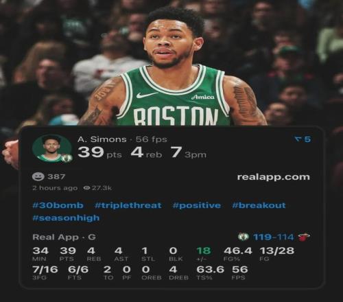 凯尔特人119-114战胜热火,完成19分大逆转。凯尔特人后卫安芬尼-西蒙斯替补出战34分钟,投篮28中13,三分16中7,罚球6中6,爆砍39分4篮板4助攻1抢断,正负值+18全场第二高!得分创造个人赛季新高,此前纪录只有27分。